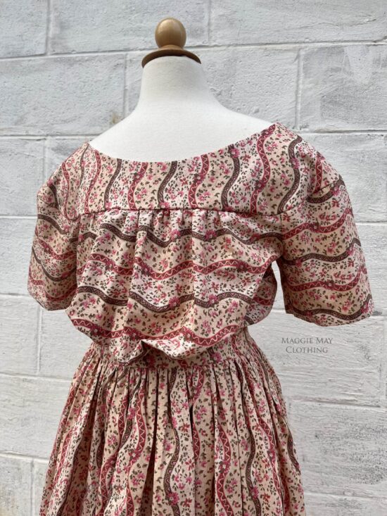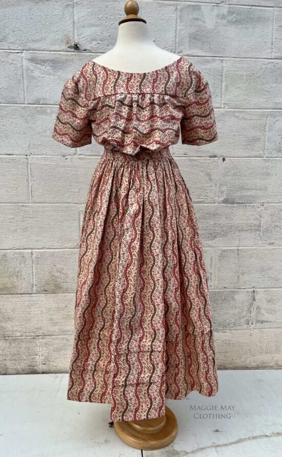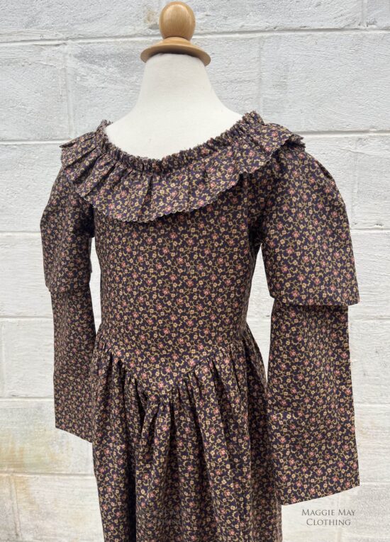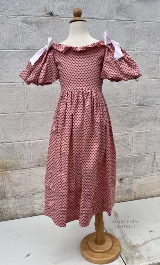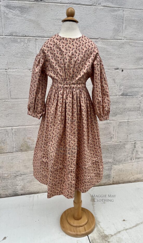 These adapted girls dresses are made from 100% cotton and include a variety of youthful period appropriate calico prints. The ruffled trim on this pink calico 1830s ERA YOUNG GIRL’S DRESS is pinked rather than hemmed as would have been done during this era.