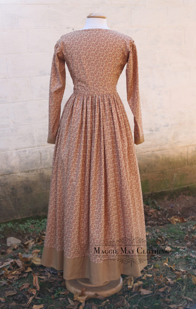 We added little decorative covered buttons to tie the contrasting hem and cuffs to the bodice. Using complementary prints is a great way to keep things interesting. So next time you find that perfect print but just don’t seem to have enough yardage, think about adding a second print! That’s what our ancestors did in the 19th century!