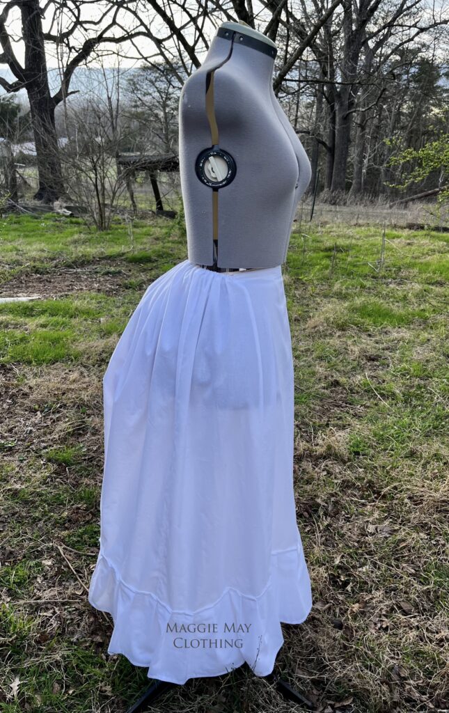 Our one piece skirt is gathered up at the center back to accommodate a bustle pad and petticoat.