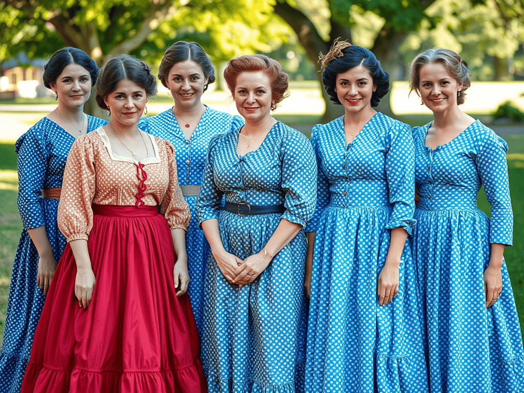 AI generated image using the keywords “Group photo of women wearing the same 1880s blue calico print dresses”. Generated January 12, 2026. It seems AI does not yet know enough about historical clothing (or colors…) to replicate the image above. Yet….