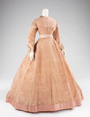 Early in the period, to emphasize the voluminous nature of the skirt, multiple outer flounces and overskirts became popular. By 1860, the ever-sought-after bell shaped skirt had disappeared and a preference for an oval shaped skirt became popular. In Europe, as early as 1861, the weight of the skirt had shifted backward and the appearance of a “flat-fronted” skirt emerged. Finer gowns often had an interchangeable day bodice and evening bodice worn with the same skirt.