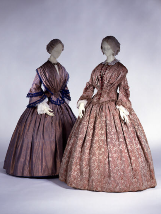 Bodices of this period ended slightly above the natural waistline. In the 1850s, feminine versions of men’s shirts, vests, and waistcoats were common separates. Thanks to the introduction of the sewing machine, time involved in making clothing was now drastically reduced and elaborate self- made trim work became popular. Lavish trimmings such as embroidery, ribbon, braid work, and ruching was used. Sleeves began to widen at the wrist and forearm. Undersleeves remained popular.