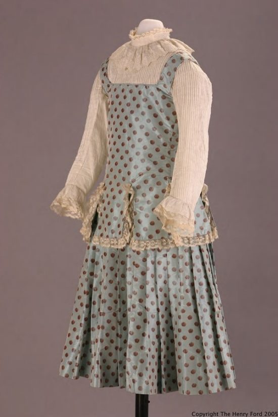 While there is documentation to suggest that premade children’s attire existed as early as 17th century Europe, it was not until the 19th century industrial age (or the age of mass production) that ready made children’s garments were available to all social classes. Before the 1860s, ready made children’s clothing was only purchased by the upper class. Tailors and “little dressmakers” visited the home of the wealthy, taking measurements and fitting garments to each child. However, by the end of the 19th century, fashion called for loosely fitted dresses and less tailored suits- allowing for a “one size fits all” industry.