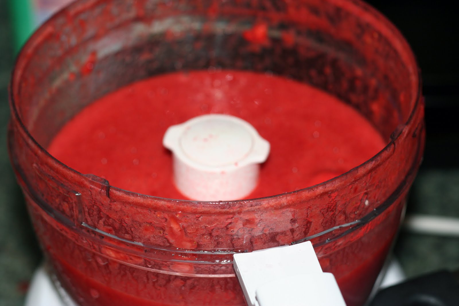 1. Prepare the fruit. Sort and wash fully ripe strawberries; remove stems and caps. Crush your berries. (I use a food processor but you can also cut the berries into small pieces or crush by hand- depending on what consistency you wish your jam to have.)