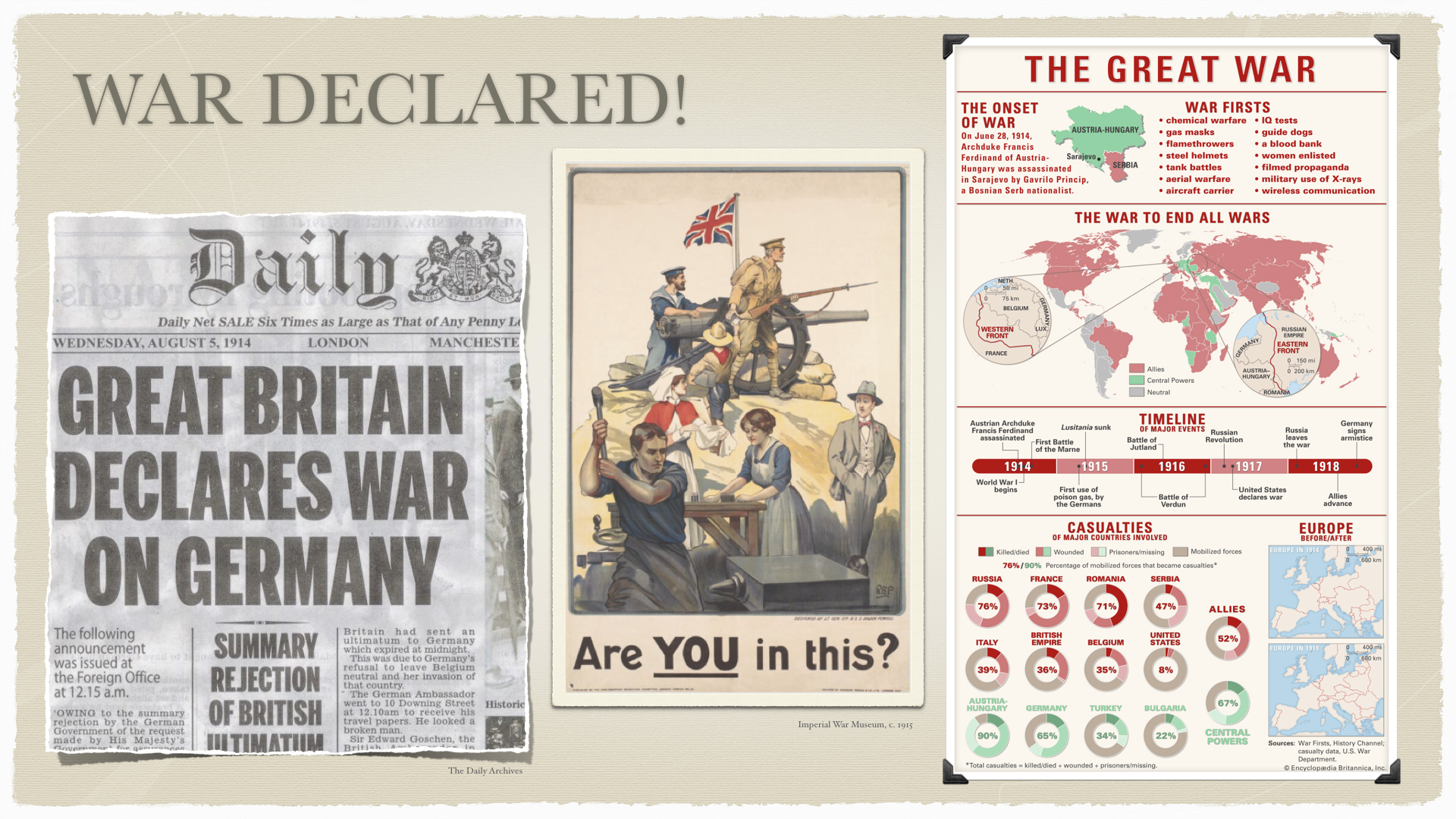 In July 1914, the world changed in a way that would inevitably rock the entire continent. While the beginning of WWI is often attributed to the assassination of Austrian Archduke Franz Ferdinand, the underlying tensions across Europe had been brewing for decades. Strategic alliances, fight for control over resources, and a changing industrial world were all factors that led to war on a scale never before seen in history.