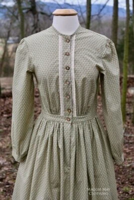 Here is another example of our Late Romantic-Victorian Era work dresses. This is our Work Woman’s Dress in a muted green-grey stripe print fabric. Our Work Woman’s dress is a more economical version of our American South Dress. It does…