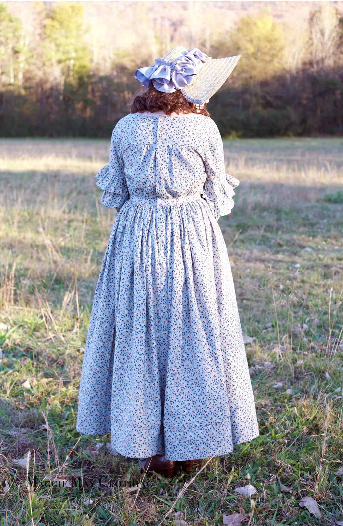The dress buttons up the back and closes at the waist with a hook and eye. Our Anne dress is shown over a chemise, corset, and 2 extra full petticoats.