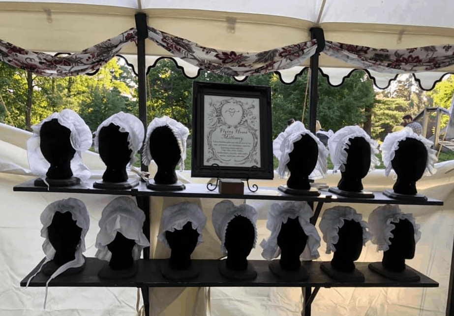 The next shop I wandered into was Flying Heart Millinery with all of her lovely, fluffy confections we call “caps.” These two ladies were some of the friendliest vendors I met at the festival and I picked out two styles of caps for my “must have” list for a little later this year. Valerie Long’s caps are made of gossamer cotton organdy or luxuriously soft linen. She hand roll- hems all of her ruffles and embroiders a sweet little white-work heart onto each one. Frankly, I have avoided caps all my historical clothing life (because they make me feel either like a little girl or a matronly old lady) but these decadent little things may just have changed my mind.