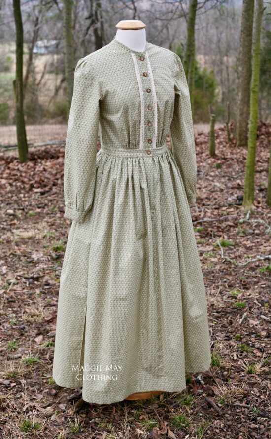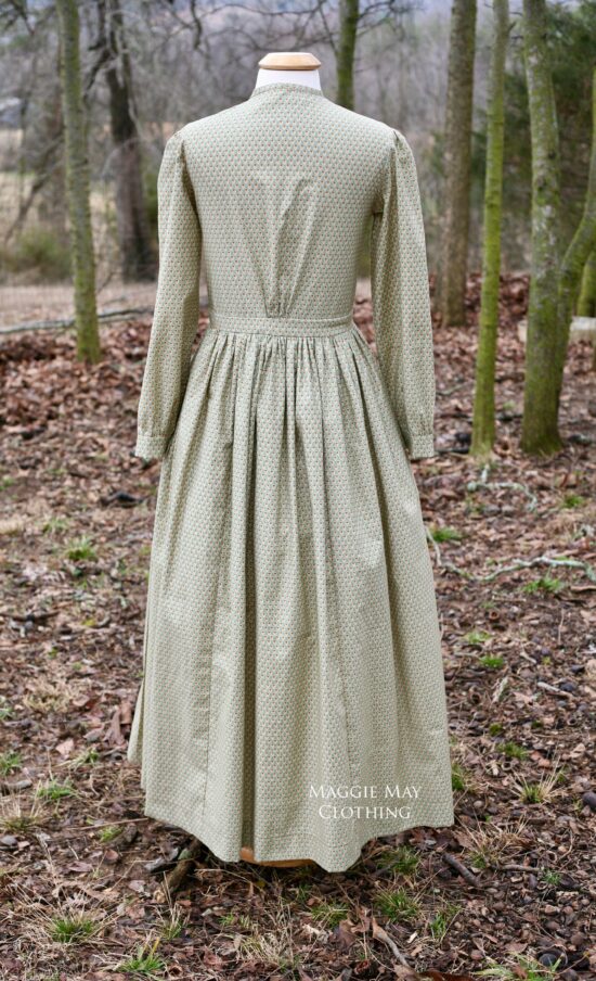 This cotton work dress is made from a green and brown calico from our fabric collection. The dress closes in the center front with buttons. Shown over our extra full petticoats and chemise (sold separately).
