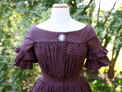 This Romantic Era dress was inspired by an original cotton American gown c. 1847 in the collection of the Metropolitan Museum of Art. This transitional style gown features wide, yoked neckline and gathered front bodice. The short, fitted sleeves are…