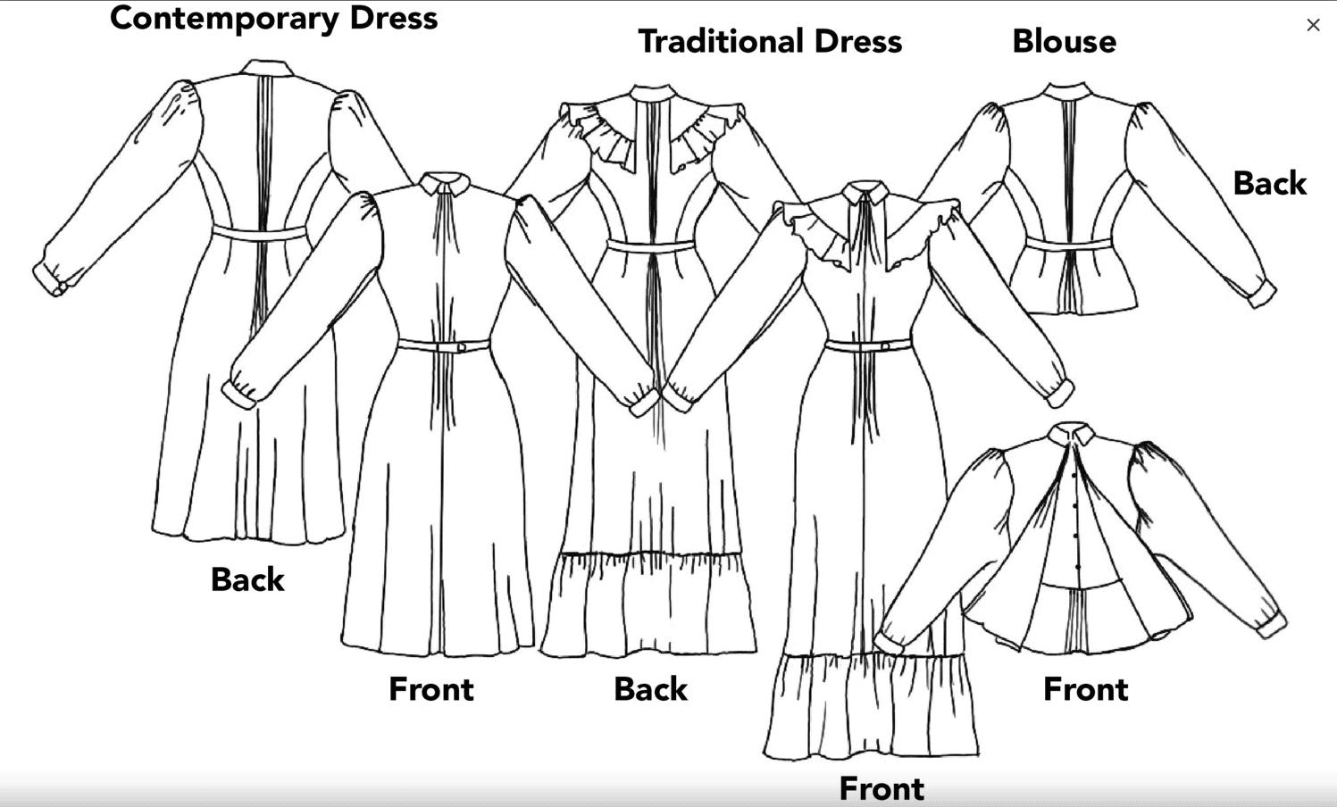The pattern may be cut street length (contemporary) or as a blouse. For day or evening wear, the dress is perfect in challis and crisp silk as well as traditional cotton calico.