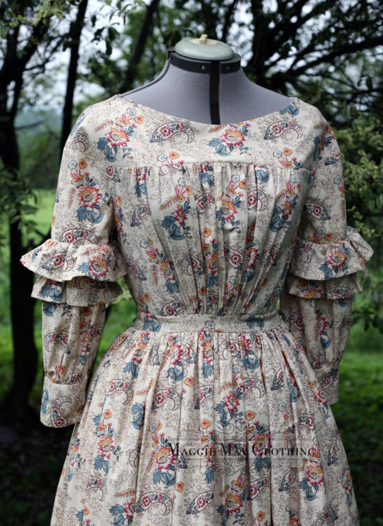 This is our Anne dress in an 1830s era reproduction cotton print found in the Metropolitan Museum of Art (see below). All the gowns we made are cut extra long at the hem as they will be finished at final fittings in Denmark.