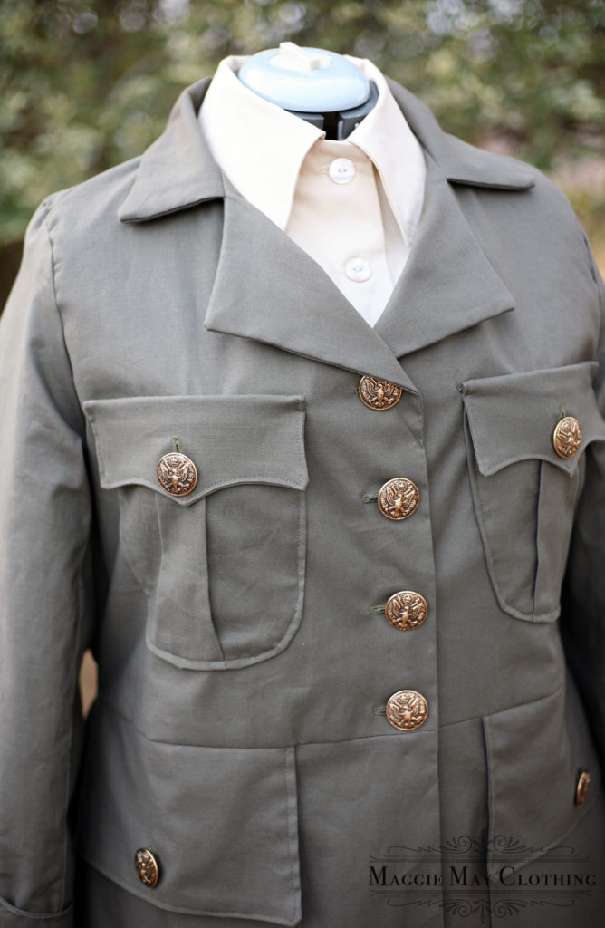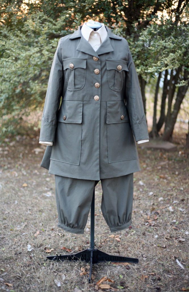 This female ambulance driver uniform is also my reproduction US Motor Corps Uniform without the Sam Browne belt and with jodhpurs in lieu of the skirt. It is inspired by the extant jacket and jodhpurs made by Abercrombie and Fitch- well known WWI uniform makers.